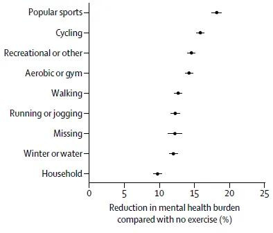 这里解释一下,Recreational sports 虽然翻译成娱乐运动,但其实也是一种团队体育锻炼,基本上指的是低强度只是为了玩的篮球足球活动(不需要计分的那种)。从这点上看倒是能解释它为什么能排到有氧体操前面,因为集体活动本身对抑郁障碍的治疗有帮助。